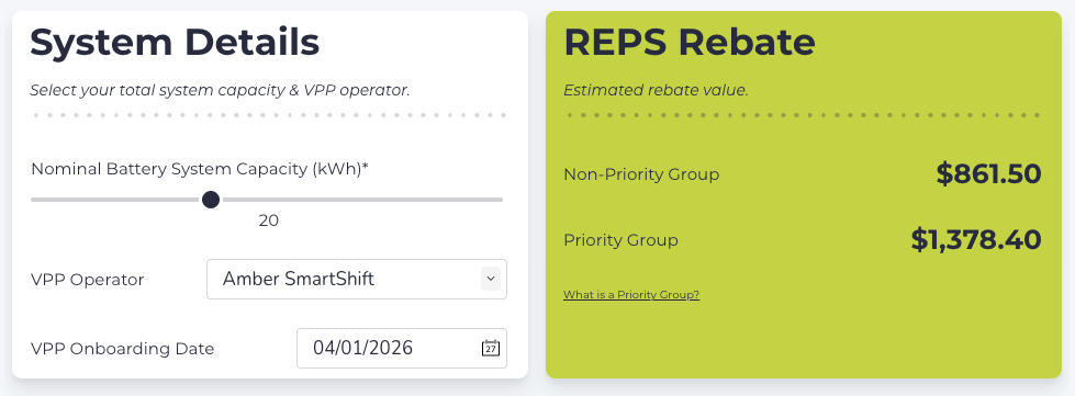 How much you are entitled to be rebated under the scheme is dependent on your battery size in kWh and if you are a ‘priority group’ or 'non-priority group' customer (as defined on the ESCOSA website here).
