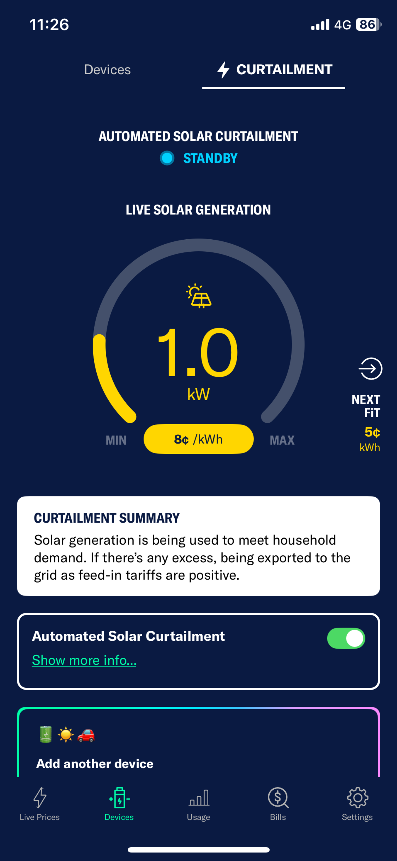 - Standby: Curtailment is enabled, but not active right now (due to positive FiT, spare battery capacity, or no solar generation)