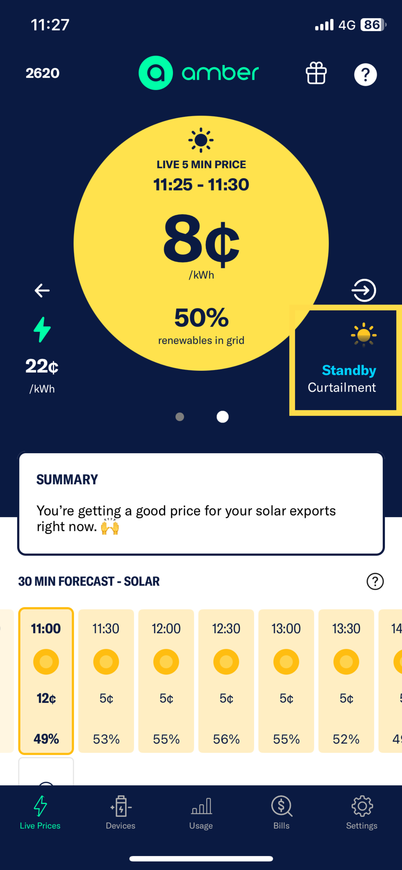 All curtailment customers will be able to see the current status of their curtailment on the export prices screen of the 'Live Prices' tab. You may also see the status displayed in your 'Devices' tab depending on whether you also have a battery enrolled with Amber for Batteries.